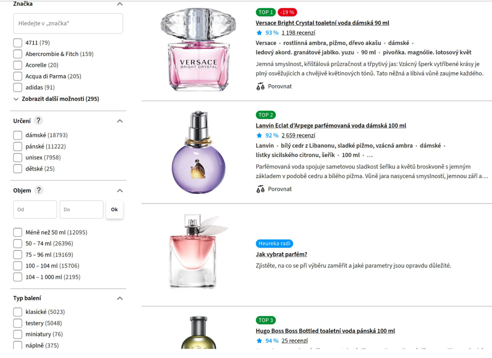 Filters on the left represent parameter name (e. g. Značka – Brand, Objem – Volume) and all possible parameter values (e. g. less than 50ml, 50–74ml for Volume).