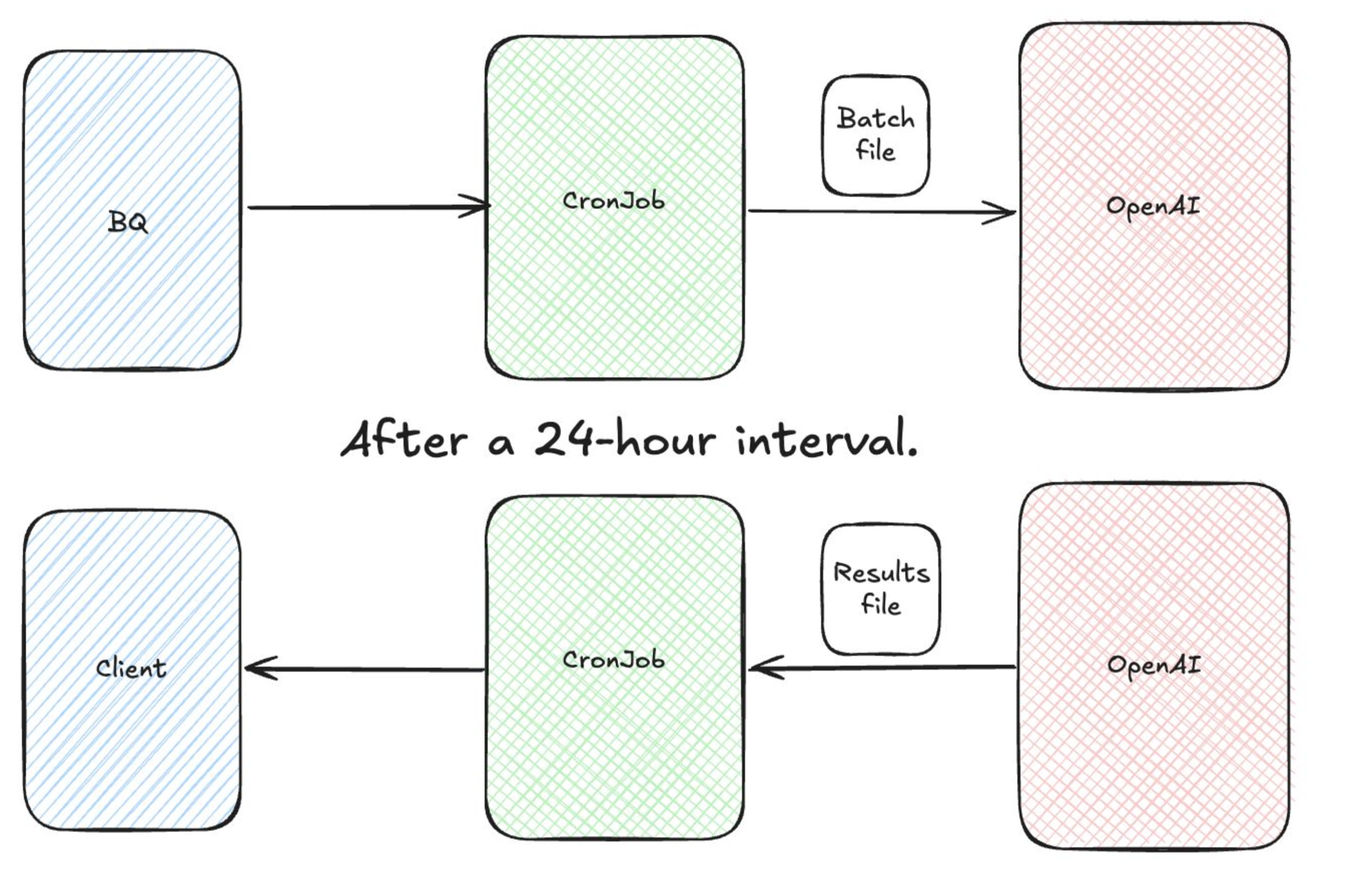 1. Extraction Job Fetches new or updated product offers from BigQuery (BQ). Offers are buffered and prepared for batch submission to OpenAI’s API.