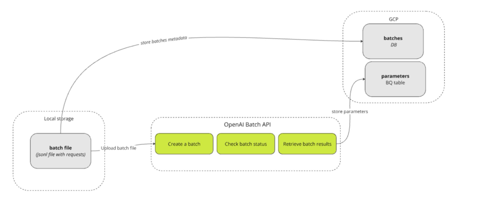 The system generates a local JSONL file, sends it to OpenAI for asynchronous processing, and stores both the output and metadata in GCP.