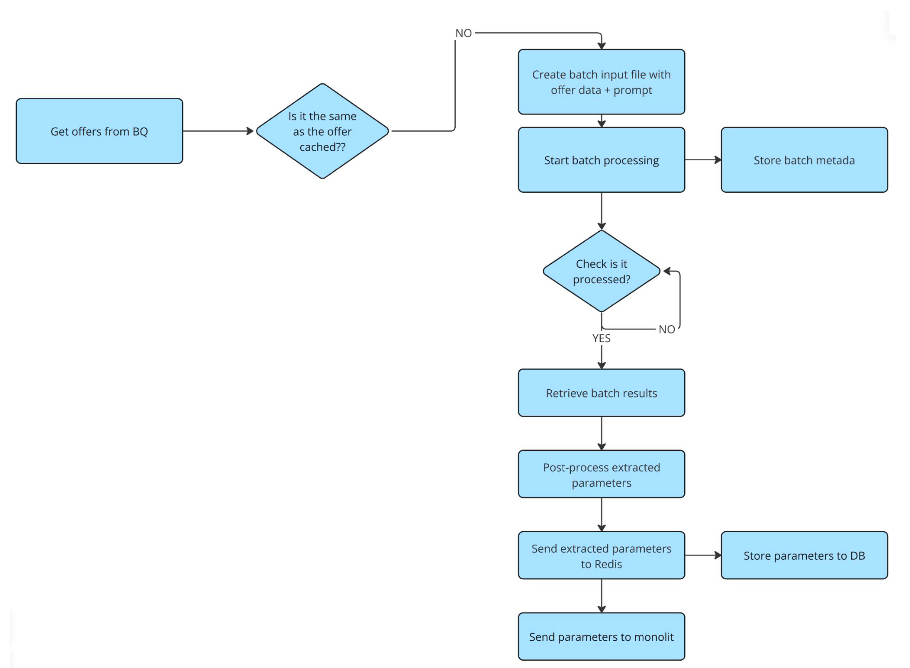 We have developed a caching mechanism that keeps track of which offers were already processed by our system. More specifically, we create a hash from the offer name and description, which is used for comparison with a newly retrieved offer. If the data hasn't changed, we skip it – saving costs and avoiding redundant API calls.
