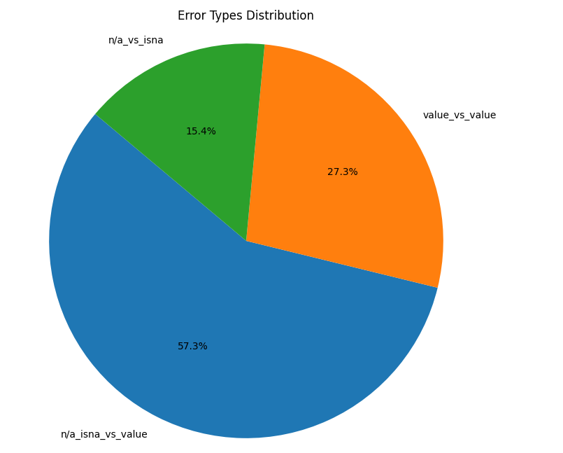 Missing vs. Found Values (57.3%): The most common mismatch occurred when one value was present, but the other was empty (e. g., None or "n/a"). This often happened when the model correctly identified a value that was missing from our target data, or vice-versa. While difficult to auto-correct, this category highlighted areas where the LLM could find information that our previous systems missed.